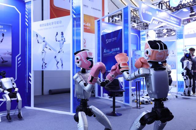 博览会另一侧,“BotShow”机器人大秀人气高涨,观众不仅可以在这里近距离观看机器人演奏或者跳舞,还能与各类机器人聊天、握手,亲密互动。其中,一场宇树科技G1机器人格斗赛格外引人注目。戴着粉色拳击手套的机器人选手率先出拳,它的对手机器人也不甘落后,第一时间敏锐地捕捉到了对方动作,并侧身躲开,一招一式之间,引得观众连连喝彩。